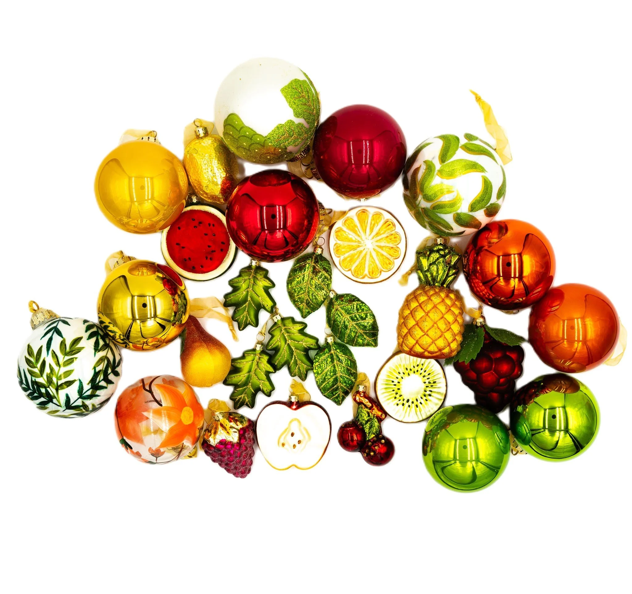 Citrus Cheer glass ornament set is bright, sunny and can be presented several ways! A fresh take on a Colonial Williamsburg Christmas; skip ribbon, florals and picks and instead pair with other decorations utilizing fresh cut greens, dried fruit, cinnamon sticks, pinecones and brew a fresh batch of Virginia Wassail or Spiced Cider. This set can also be enjoyed as a colorful and whimsical citrus theme; add a 4” wired bright plaid ribbon along with this earthy, 4” wired burlap ribbon with tiny flecks of green sparkle to tie the look together flawlessly. Designer Tip for High Visual Impact: enjoy these ornaments year-round and cheer up any space!