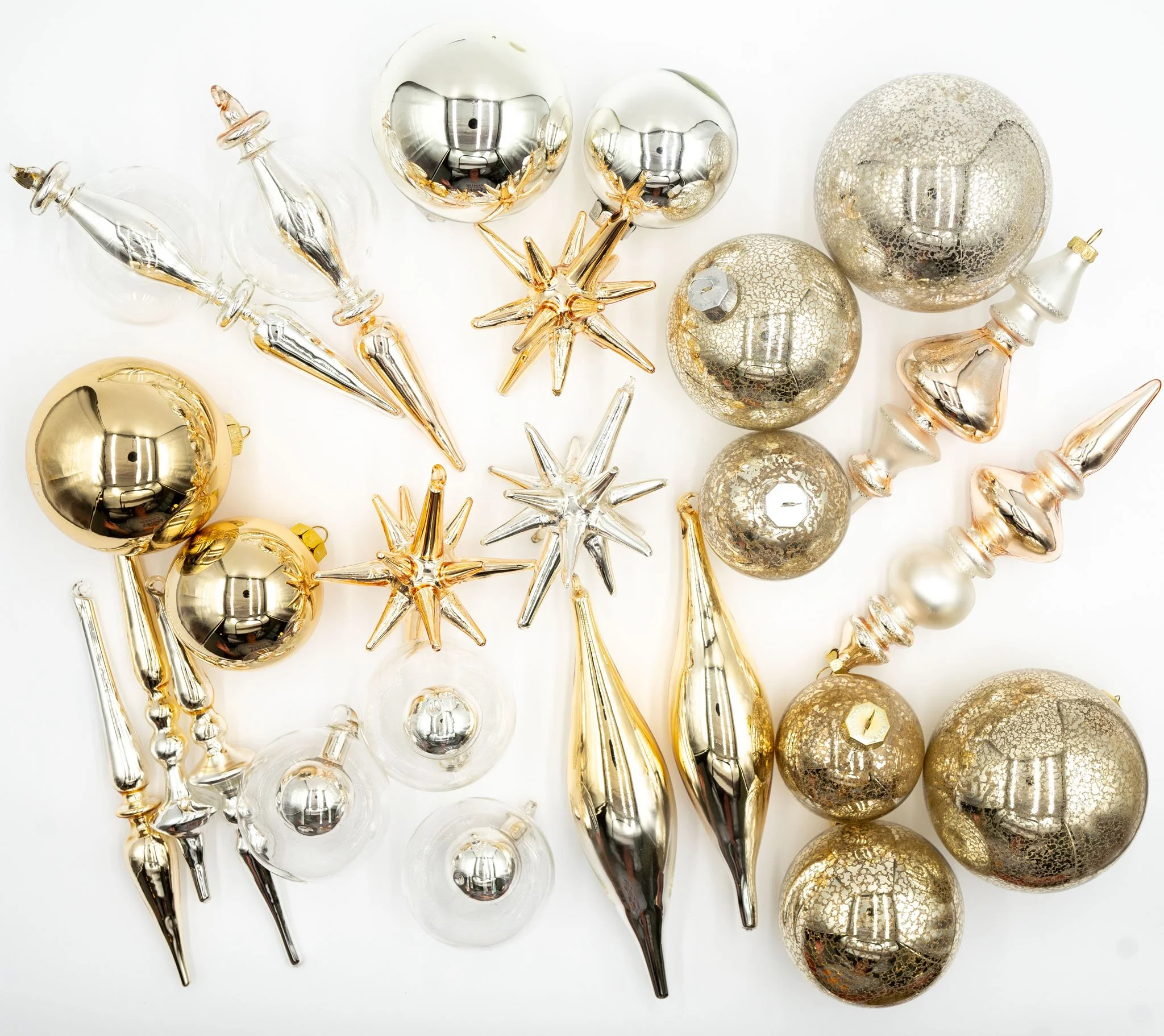 For a sophisticated, modern vibe, Metallic Radiance offers silver, gold and rose gold toned glass ornaments that are simplistically crafted. The ornaments range from 3-D stars to finials and balls with unique metal embellishments. Designer Tip for High Visual Impact: Keep the design clean, skip the use of any ribbon or florals, add a metallic finial tree topper and strategically place individual, wispy silver, gold and rose gold shooting picks and other modern clear glass ornaments such as ice sickles. These reflective ornaments will light-up any tree!