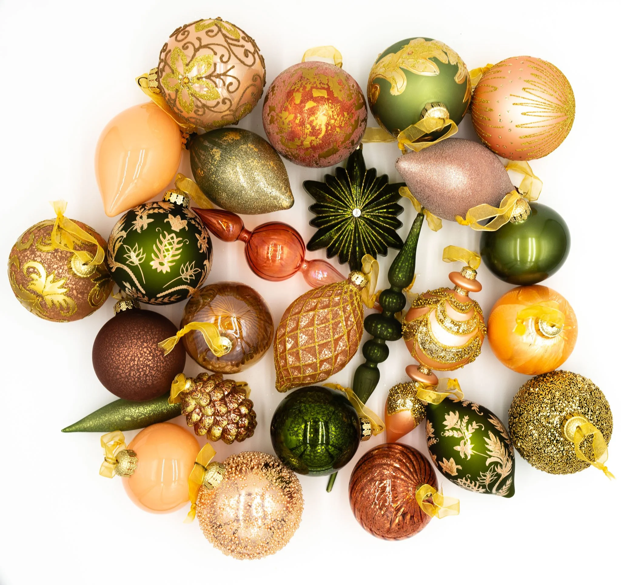 This special collection boasts gorgeous shaped glass ornaments in peach, sunrise, moss green, hues of bronze and the softest gold. The swirl details of the mouth-blown finials, hand-painted glitter and designer 4” embroidered, wired ribbon is the perfect culmination. Paired with additional tonal glass ornaments and picks, this earth-tone collection will dazzle guests and toast in the New Year! Designer Tip for High Visual Impact: pair this collection with an embroidered tree skirt in a soft ivory, peach or moss green!